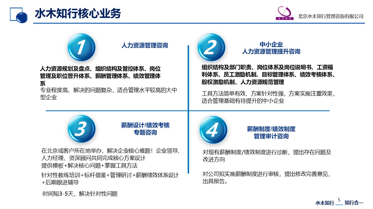北京水木知行管理咨詢有限公司(www.bjsmzx_com.wenkujiayuan.com)專注提供人力資源管理咨詢、人力資源管理培訓、人力資源招聘咨詢、人力資源獵頭服務業務;咨詢業務范圍包括組織結構與管控體系、崗位管理體系、薪酬管理體系、績效管理體系,咨詢形式包括全過程咨詢、教練式咨詢和特訓班;培訓業務包括企業基礎管理...[詳情]